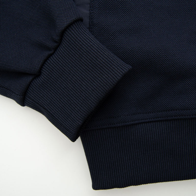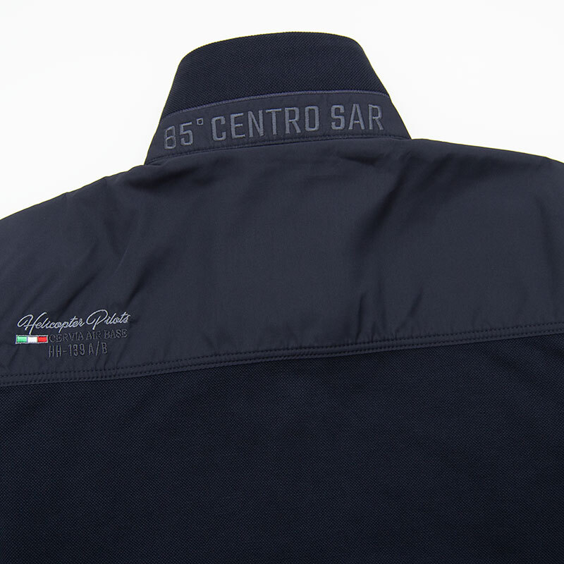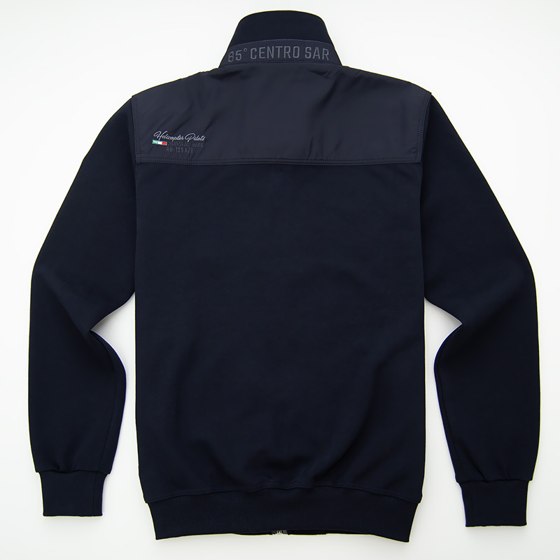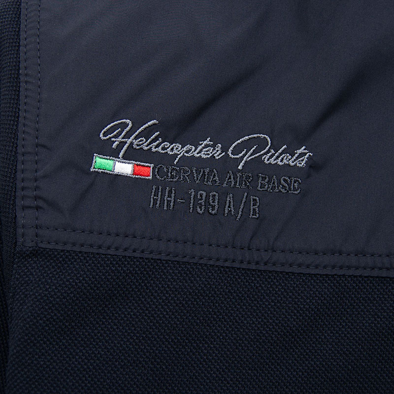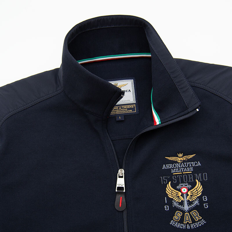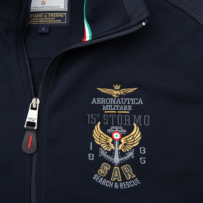 Толстовка "Aeronautica Militare" из плотного пике с застёжкой на полном замке. Плечи и верх спины обшиты мягкой плащёвкой. На груди, спине и воротнике выполнена фирменная вышивка, на рукаве жаккардовый шеврон. Карманы на замке, закрыты листочками, на бегунке замка декоративный пуллер. Низ и края рукавов на резинке.