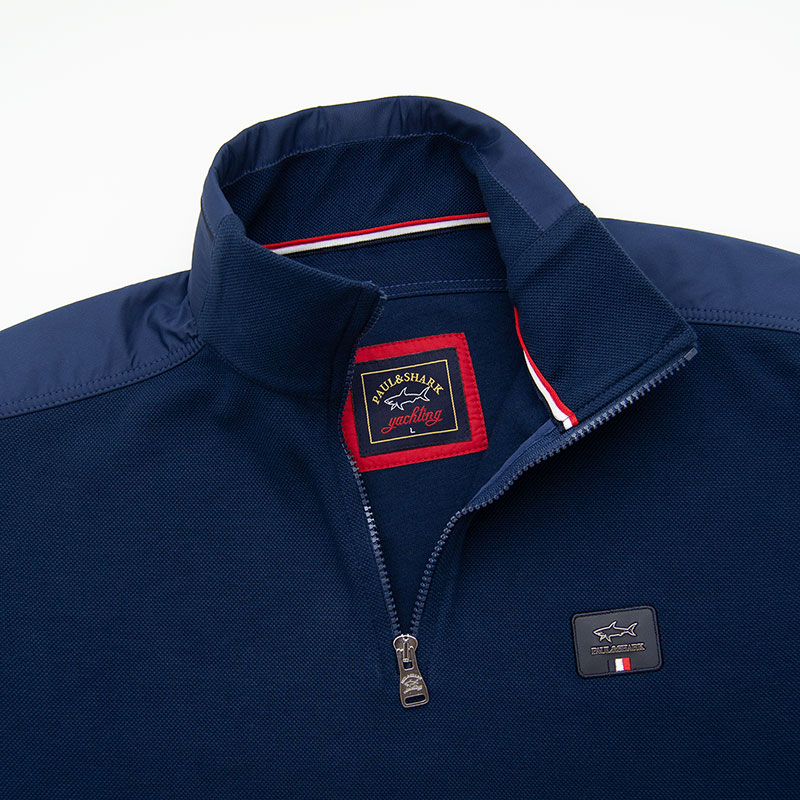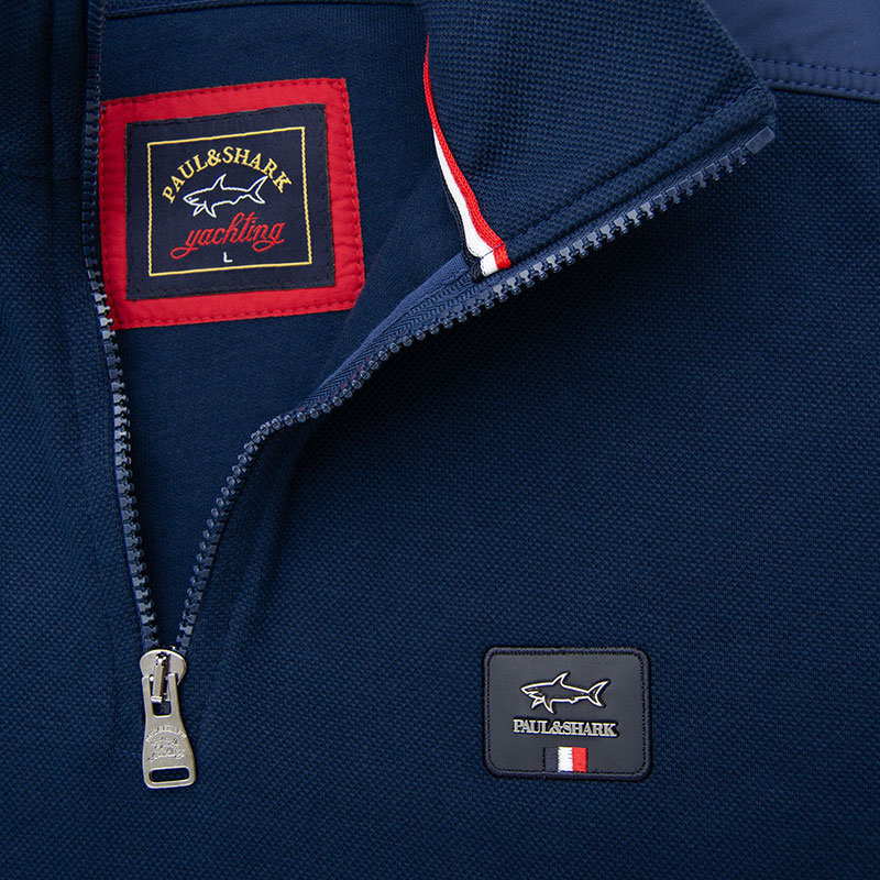 Толстовка "Paul and Shark" из плотного пике с застёжкой на замке. Воротник, верх спины и лампасы рукавов обшиты мягкой плащёвкой. На груди прорезиненный шеврон, на рукаве имеется небольшой карман и вышитый шеврон. Низ и края рукавов на резинке.