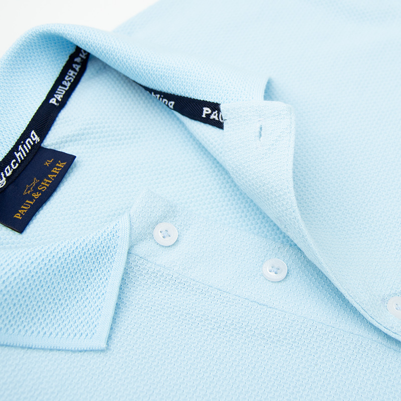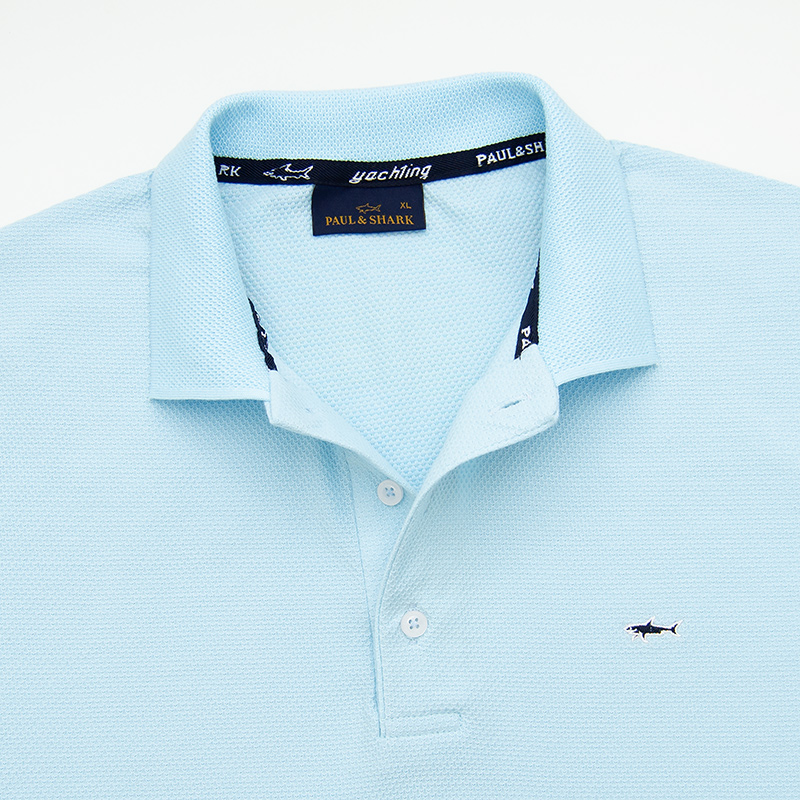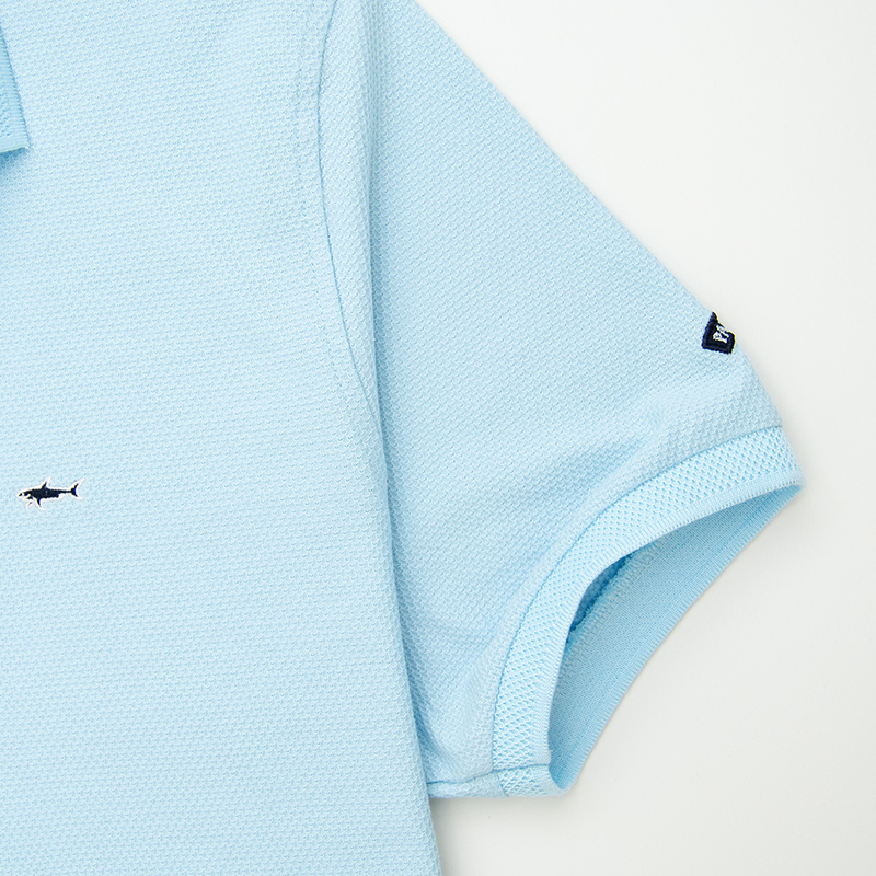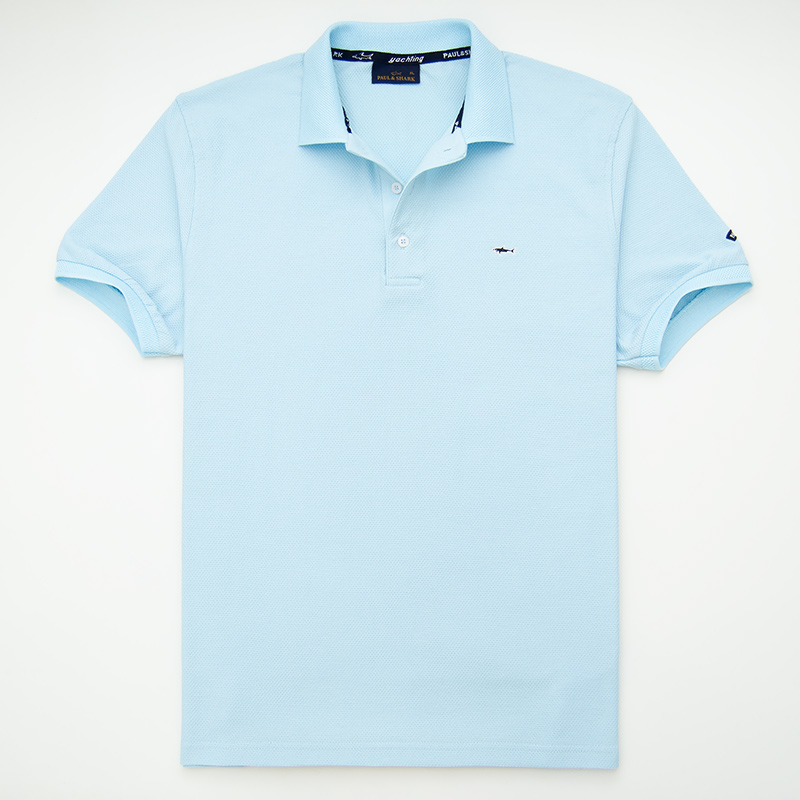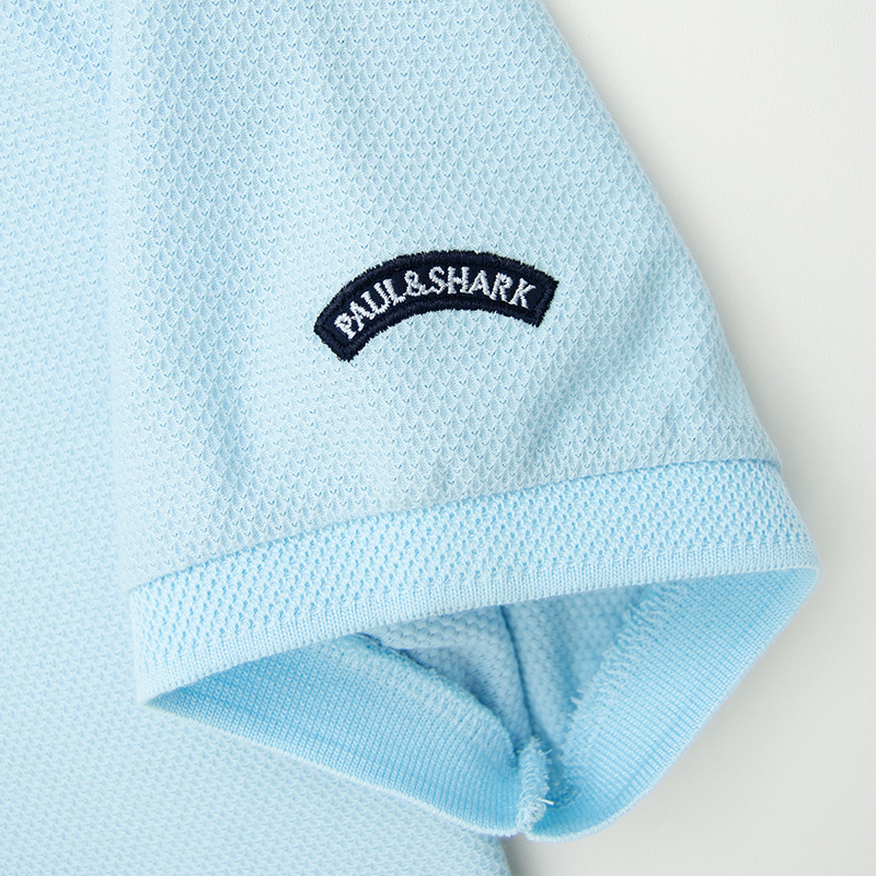 Хлопковое поло "Paul and Shark" с сотовой фактурой материала. Застёжка на трёх пуговицах. На груди вышивка в виде акулы, на рукаве вшитый шеврон. Внизу боковые разрезы, с отделкой киперной лентой.