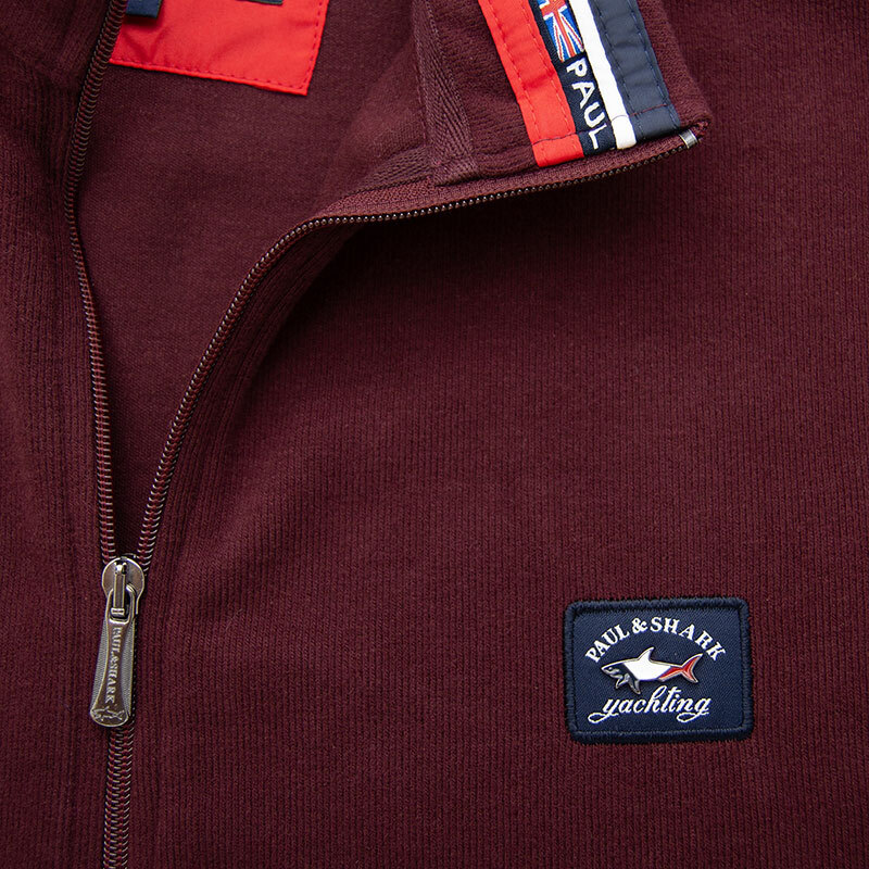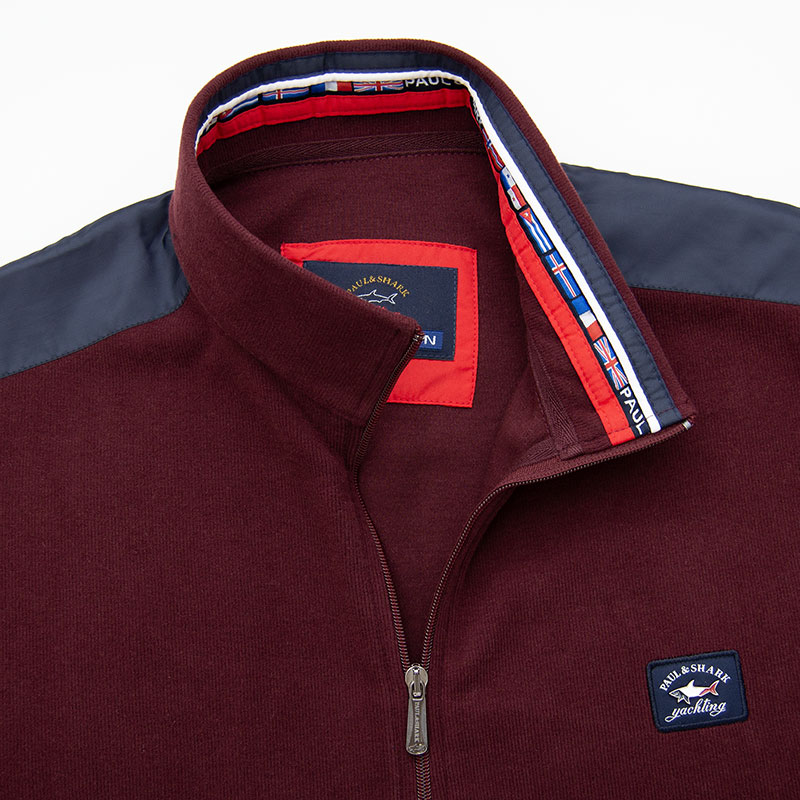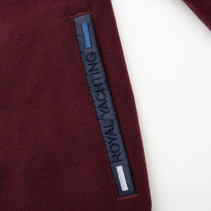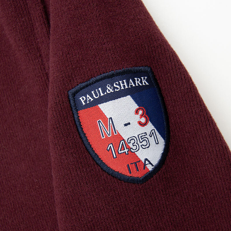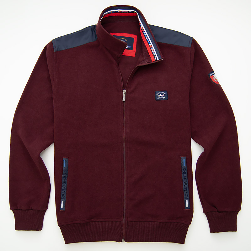 Толстовка на полном замке с воротником-стойкой. Материал модели - мягкий бархатный селаник. На груди вшит жаккардовый шеврон с металлическим лого акулы. На рукаве вшитый жаккардовый шеврон. Плечи обшиты "погонами" из плащёвки. Внутренняя сторона воротника украшена цветными лентами. Карманы прорезные на замках, листочки выполнены из плащёвки и декорированы вышитыми надписями. Низ и края рукавов на резинке.