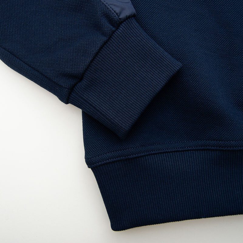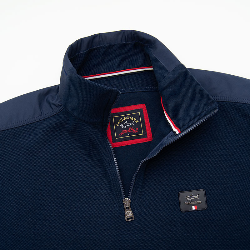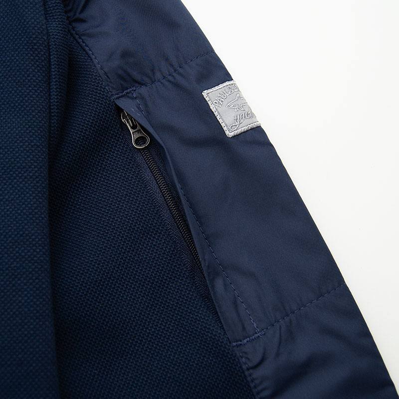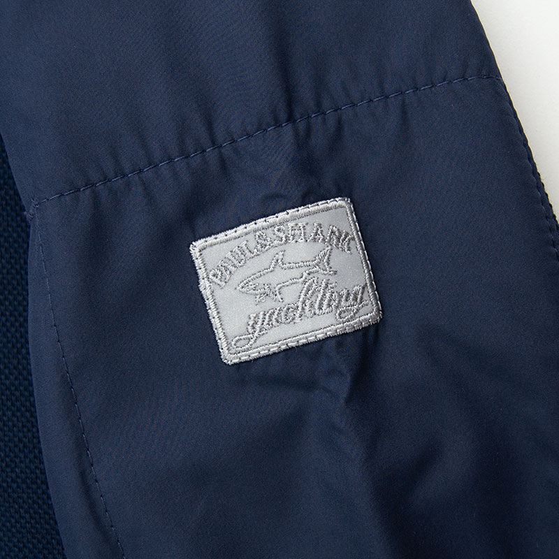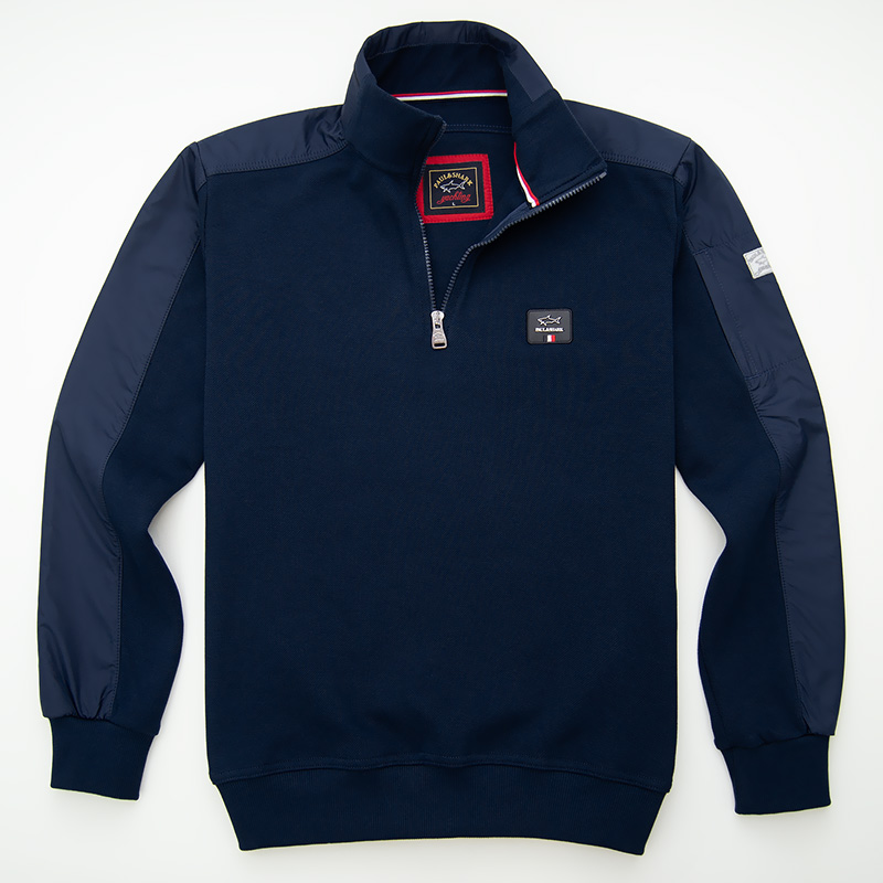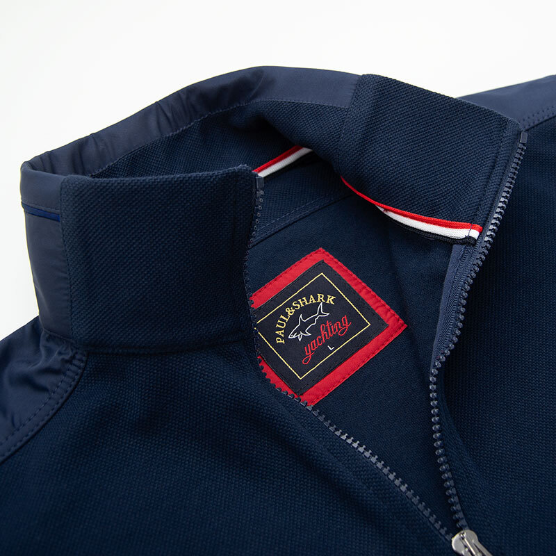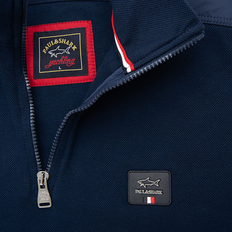 Толстовка "Paul and Shark" из плотного пике с застёжкой на замке. Воротник, верх спины и лампасы рукавов обшиты мягкой плащёвкой. На груди прорезиненный шеврон, на рукаве имеется небольшой карман и вышитый шеврон. Низ и края рукавов на резинке.